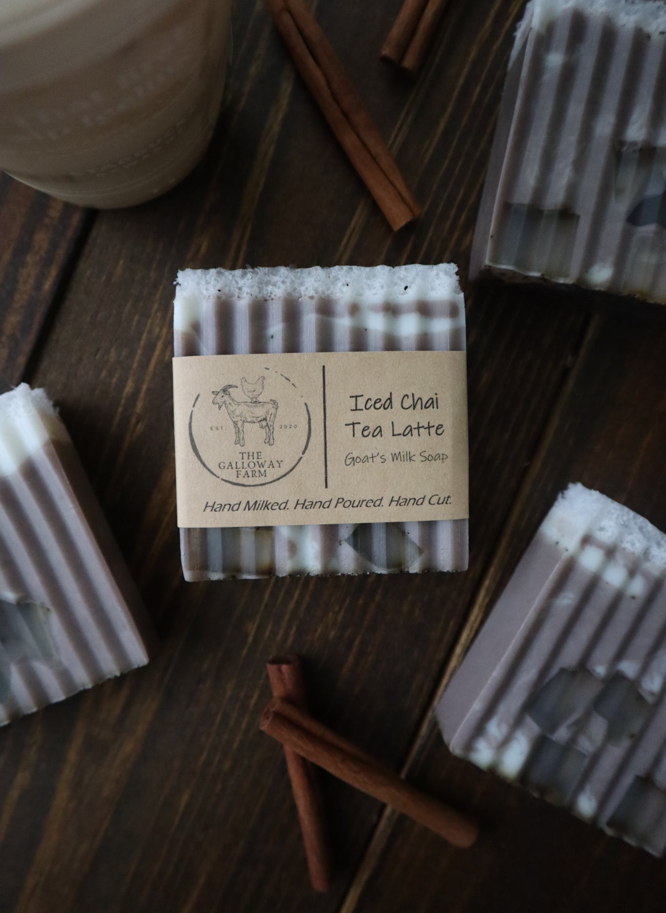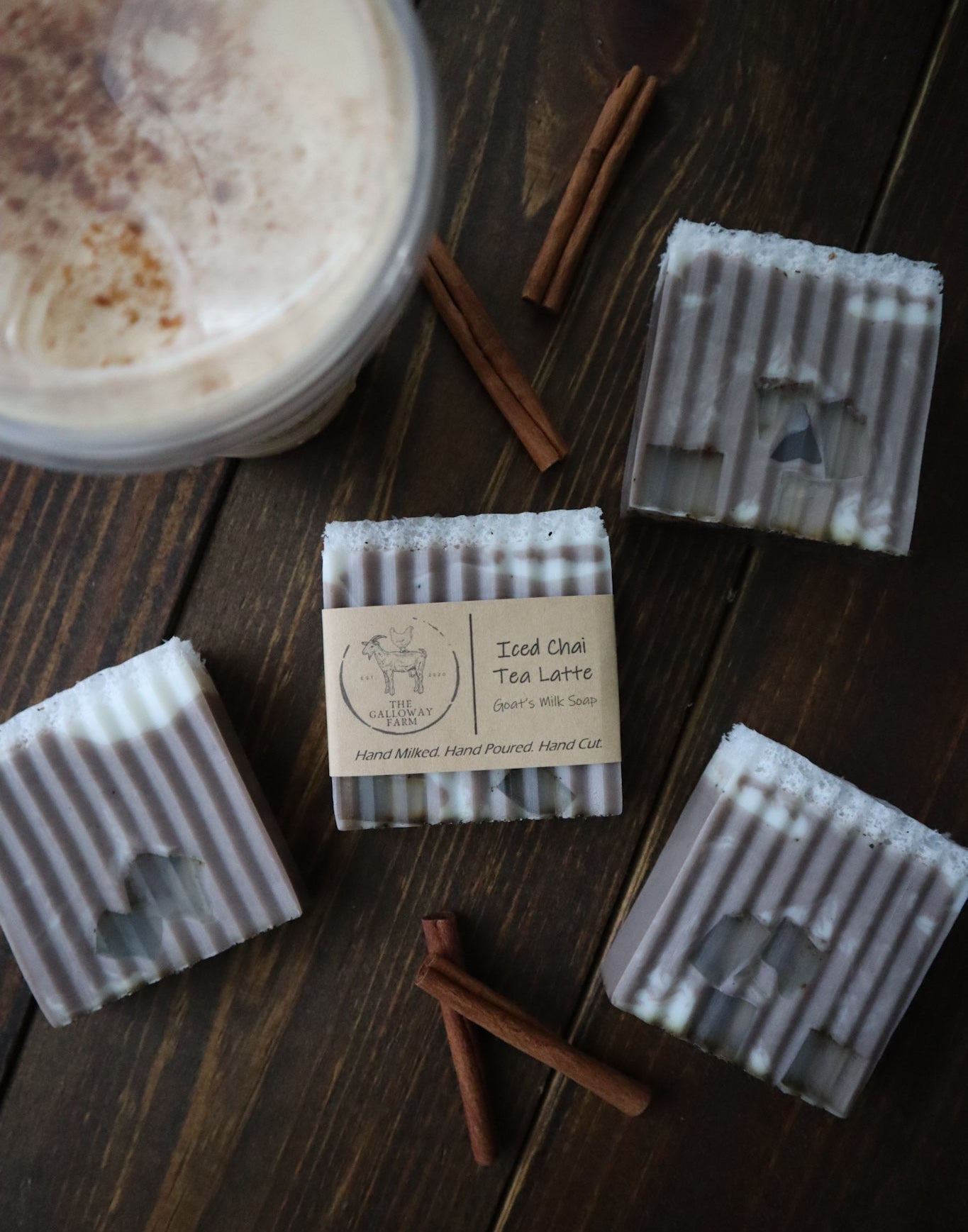 Ingredients: Galloway Farm goat's milk; coconut, palm, and safflower oils; distilled water; essential oil; mica powder; sodium hydroxide; chai tea packet contents (black tea, natural chai, cinnamon, ginger, cardamom, clove)