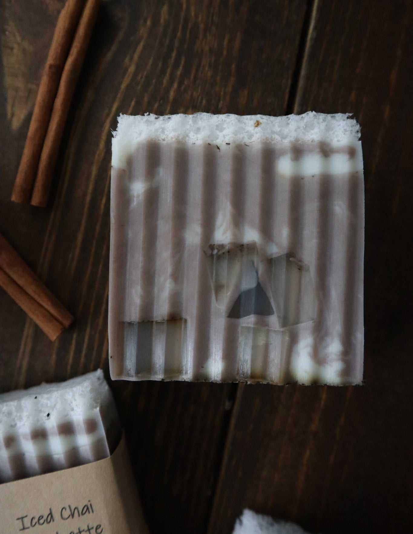 A signature fall drink in a soap! 🧋 Our Iced Chai Tea Latte soap encapsulates what we love about fall with its blend of vanilla, cinnamon, cardamom, clove, and nutmeg essential oils. This soap contains the contents of 1 chai tea packet (black tea, natural chai, cinnamon, ginger, cardamom, and clove) for added exfoliation. We also included ice cubes (clear soap base) and a frothy soap top to resemble your favorite fall drink! The warm and comforting blend of spices pairs perfectly with nutrient dense, moisturizing goat's milk to keep your skin hydrated in cooler weather.